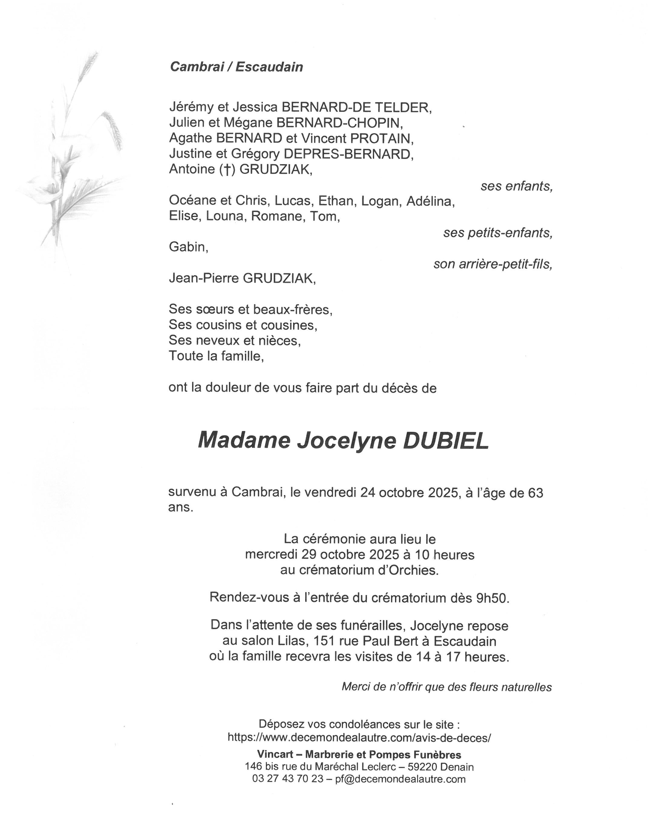 Déroulement des funérailles de Madame Jocelyne DUBIEL